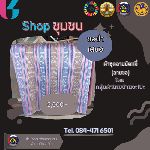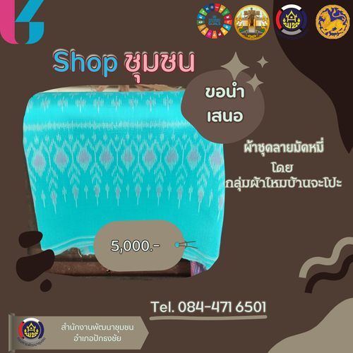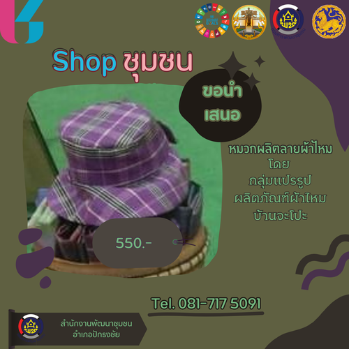 ขอนำเสนอผ้าชุดลายมัดหมี่ โดยกลุ่มผ้าไหมบ้านจะโปะ และ หมวกผลิตลายผ้าไหม โดยกลุ่มแปรรูปผลิตภัณฑ์ผ้าไหมบ้านจะโปะ